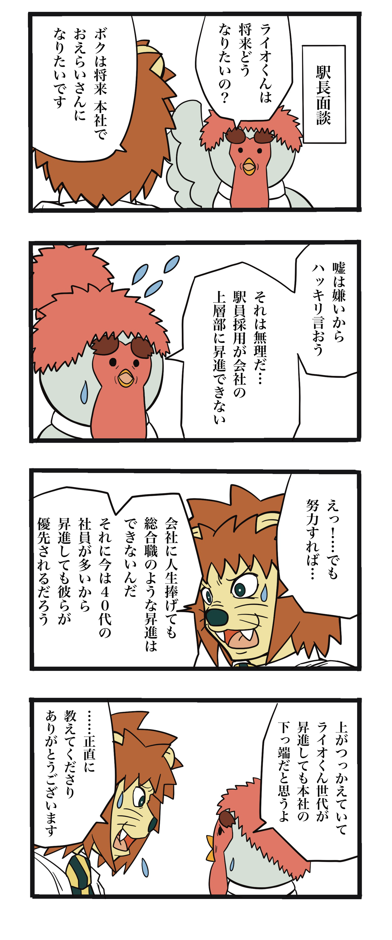 暴君ライオン駅員さん 第36話 2021年06月15日 07:00 【次の話を読む】 【第1話から読む】【駅員あるある漫画を読む】<元駅員一言メモ>さすがに駅長はここまではっきりとは言いませんが、係長や先輩ははっきりと教えてくれます。総合職と駅務採用では越えられぬ壁があります。まぁ会社によるのかもしれませんがw次のお話へ東ハト ふわうま! うましお味 60g ×12袋東ハト2021-02-01 ▲このお菓子うますぎます!カールに似てるような気がしますが、カールよりも柔らかい!! 「暴君ライオン駅員さん〈第2部〉」カテゴリの最新記事 < 前の記事次の記事 > コメント コメント一覧 (1) 1. ナナシさん 2021年06月15日 07:16 関西私鉄で働いてますが越えられない壁が確かにあります笑 かなり高い所に上り詰めた人も居ますが競争競争の連続だったようです。 0 ザバック がしました コメントフォーム 名前 コメント 記事の評価 リセット リセット 顔 星 情報を記憶 コメントを投稿する