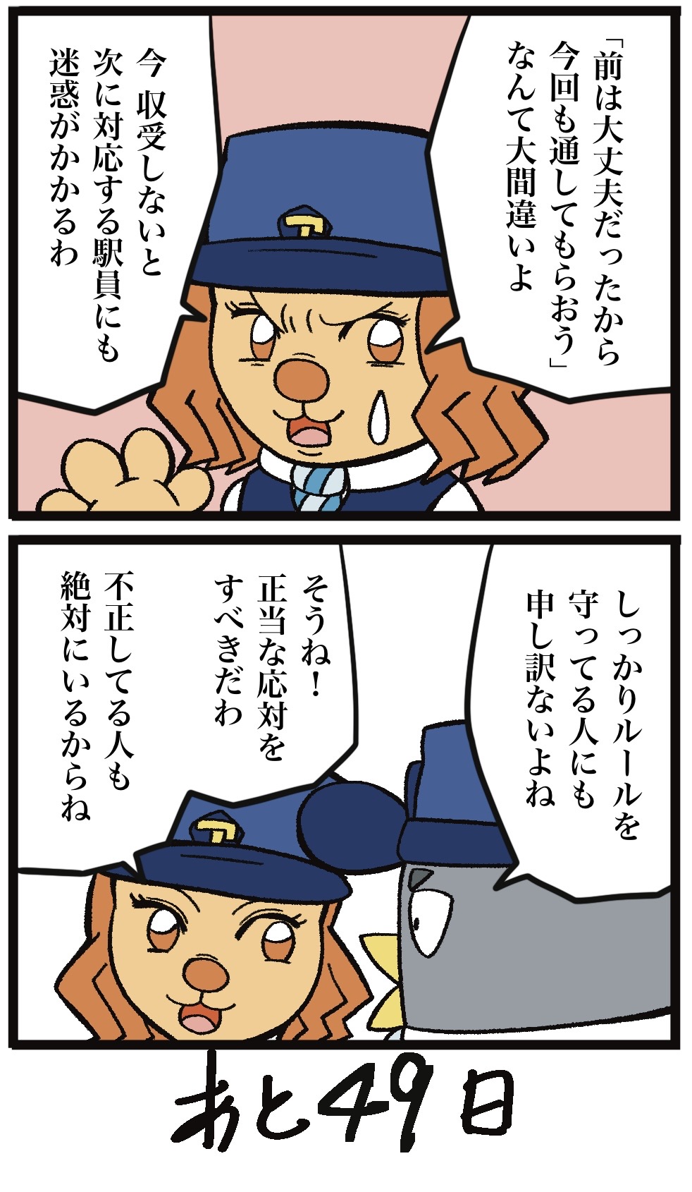 100日後にやめる契約駅員さん 51日目 2022年07月20日 08:00 □前のマンガはこちら■ 二人のタメ口での会話がやっと始まりました。先輩に言われたのが「今、規則通りに再収受しないと次の駅員に迷惑がかかる」これはすごい頭に残っています。□次のマンガはこちら■ □第1話はこちら■ □関連マンガはこちら■ □最新マンガはLINE登録■ 「100日後にやめる契約駅員さん〈第3部〉」カテゴリの最新記事 < 前の記事次の記事 > コメント コメント一覧 (1) 1. 頑張って下さい! 2022年10月17日 15:49 共感!いつも言っています。 正当な取扱いをする時に文句を言うような人には徹底的にやります。 0 ザバック がしました コメントフォーム 名前 コメント 記事の評価 リセット リセット 顔 星 情報を記憶 コメントを投稿する